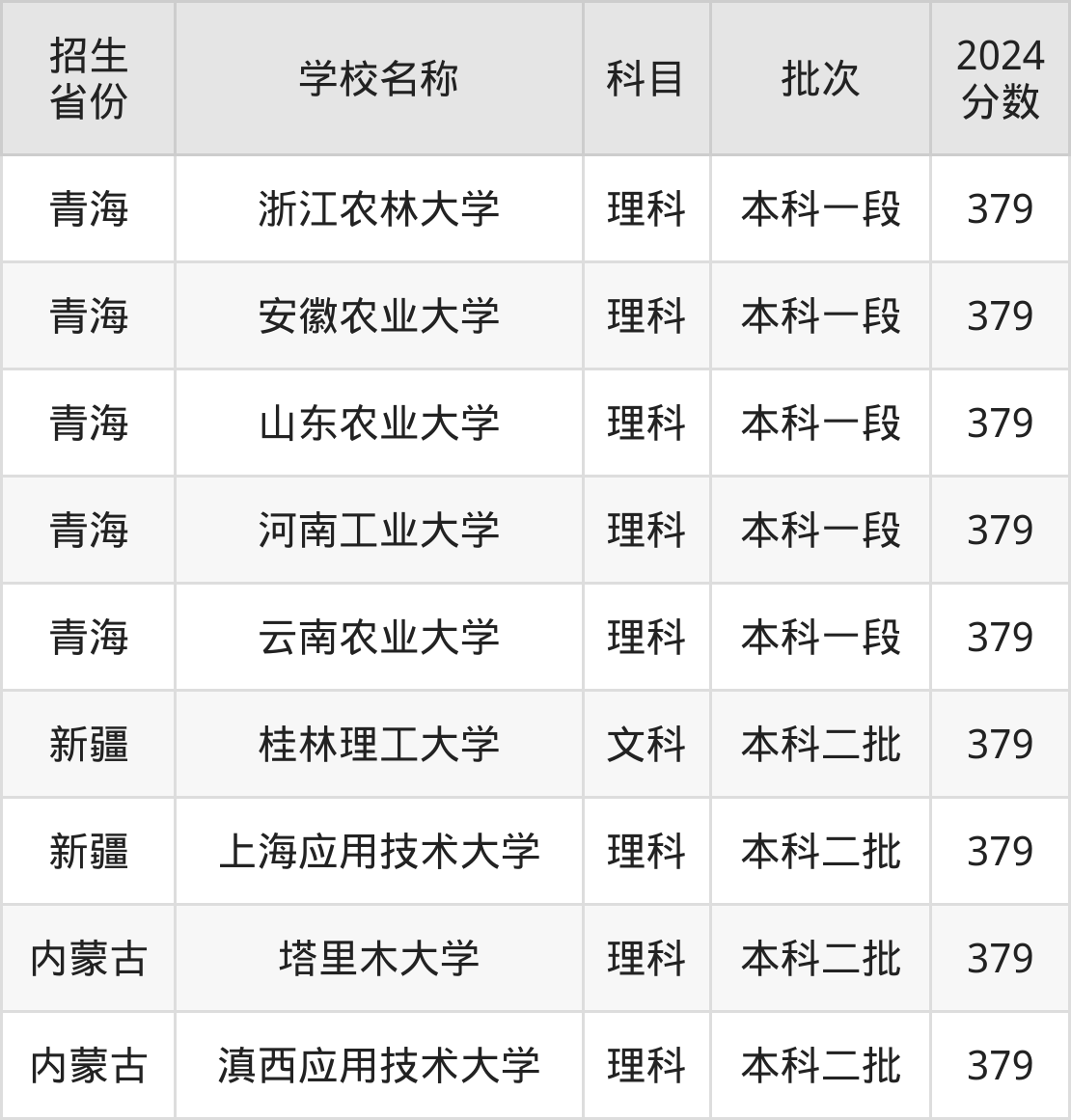 筛选全国各省2024年录取分数线为379分的一本大学如下: