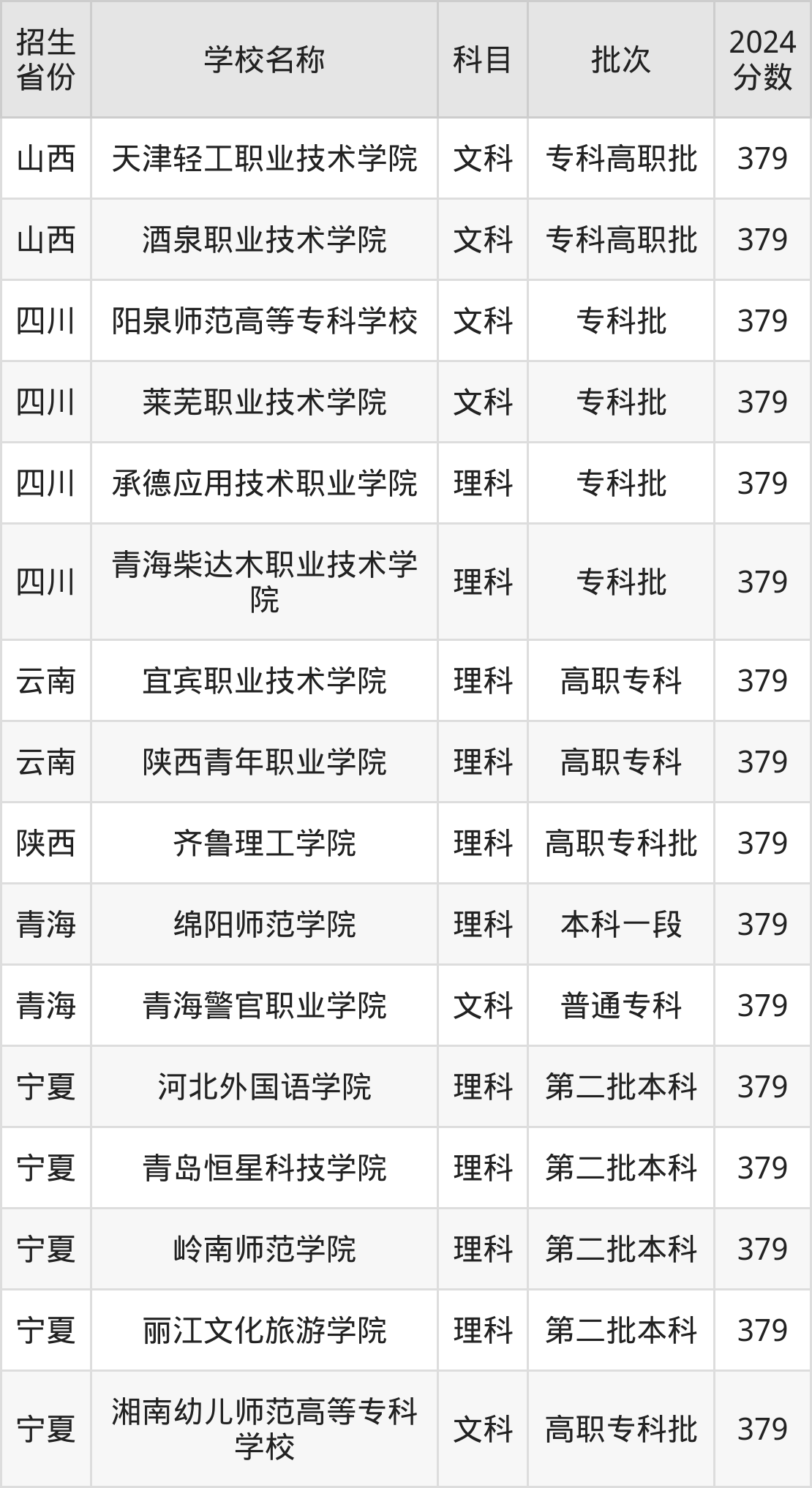 四川省理科分数线是379分的文科大学有:承德应用技术职业学院、青海柴达木职业技术学院。