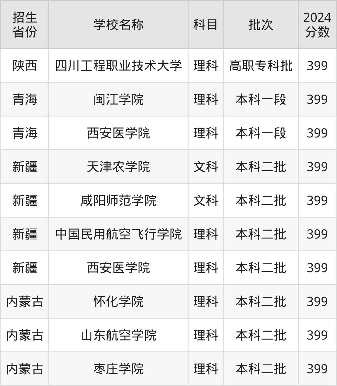 筛选全国各省2024年录取分数线为399分的二本公办大学如下: