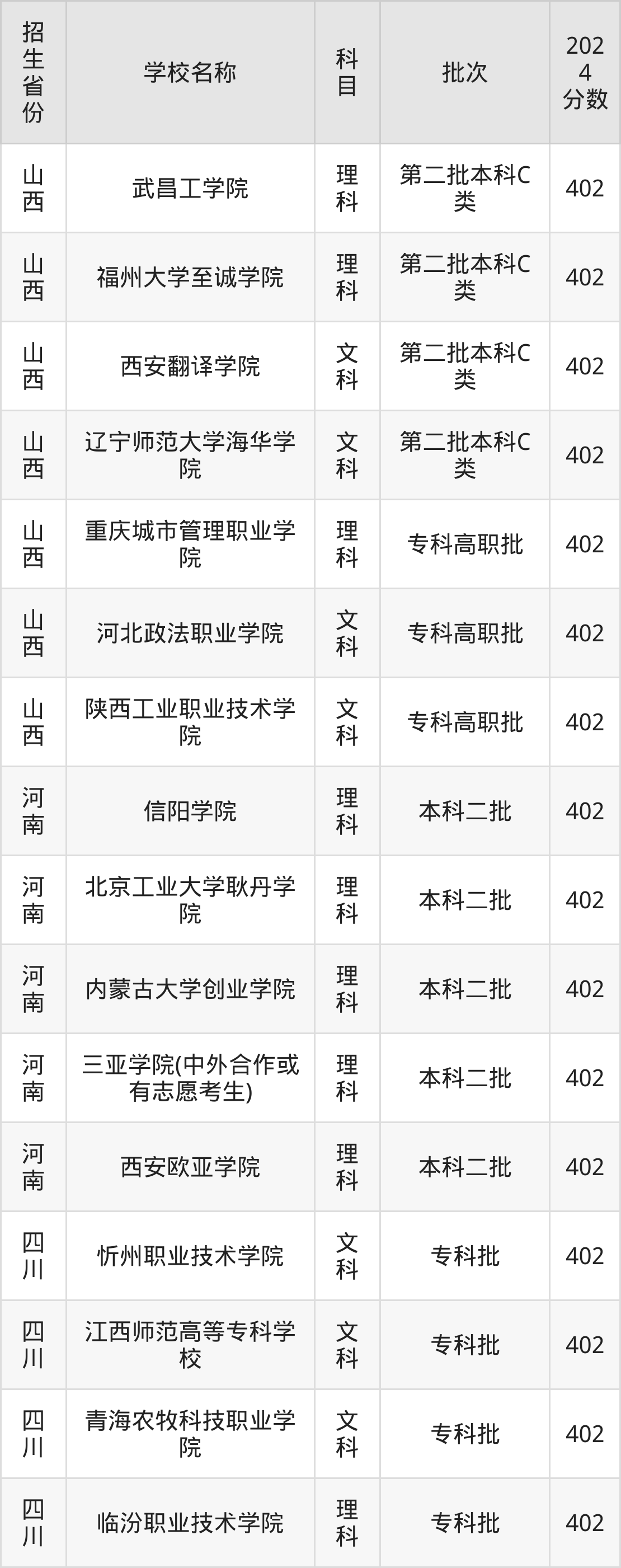山西省理科分数线是402分的文科大学有:武昌工学院、福州大学至诚学院、重庆城市管理职业学院。