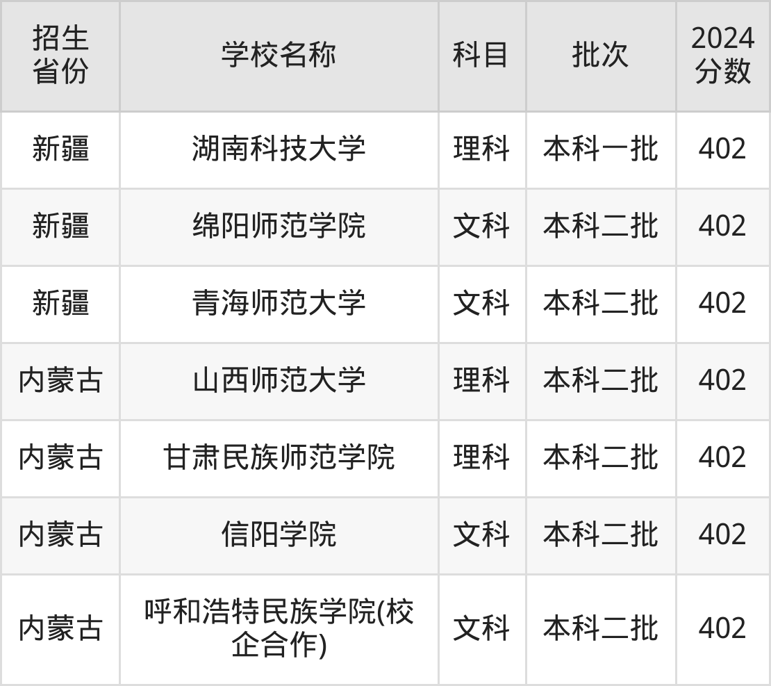 筛选全国各省2024年录取分数线为402分的文科大学如下: