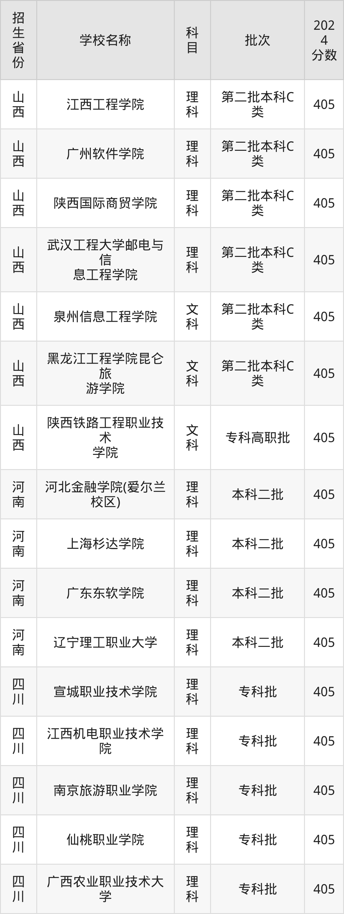 山西省理科分数线是405分的理科大学有:江西工程学院、广州软件学院、陕西国际商贸学院、武汉工程大学邮电与信息工程学院。
