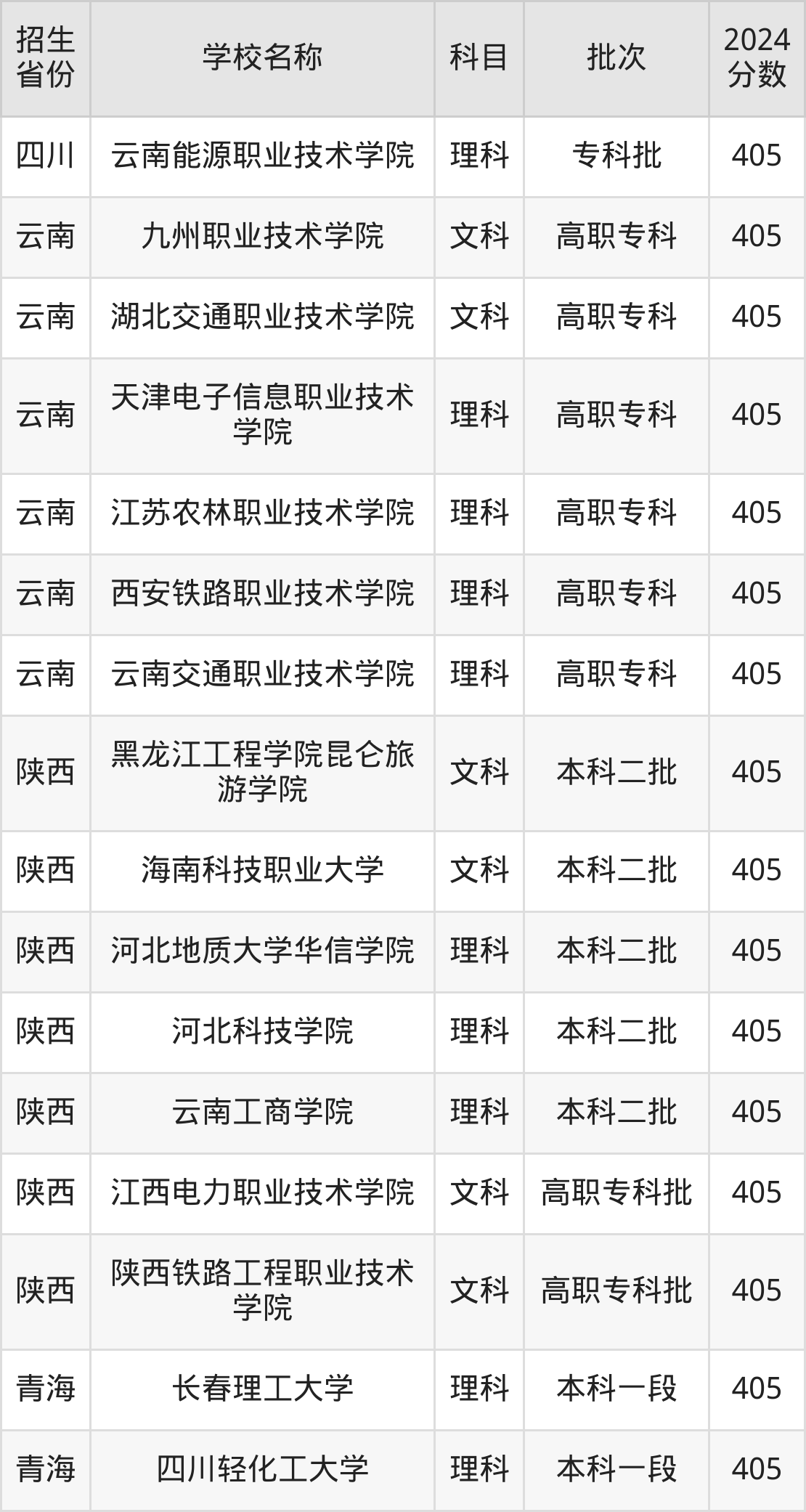 筛选全国各省2024年录取分数线为405分的理科大学如下: