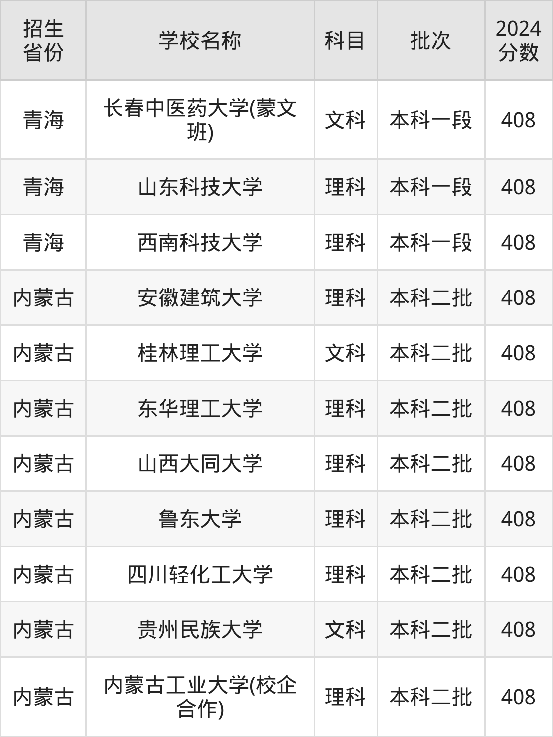 筛选全国各省2024年录取分数线为408分的一本大学如下:
