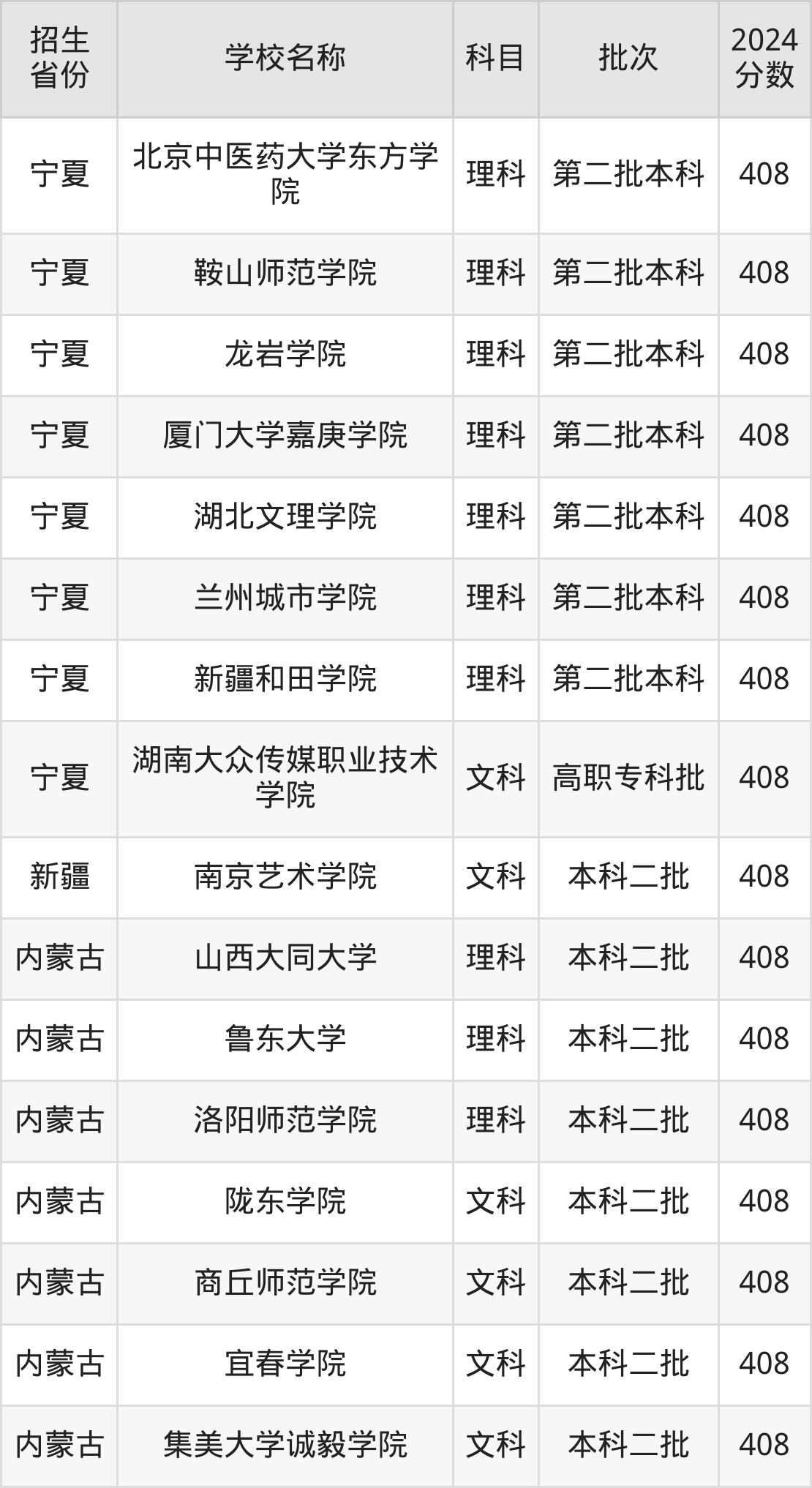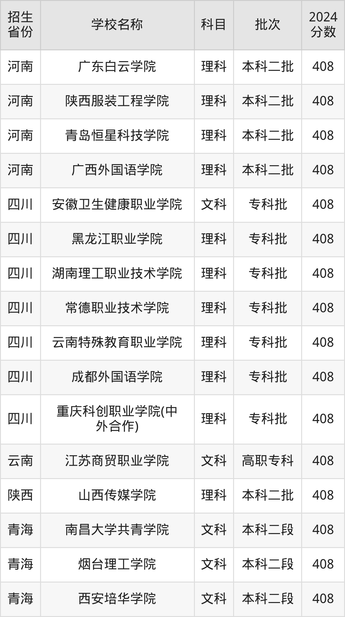 筛选全国各省2024年录取分数线为408分的文科大学如下: