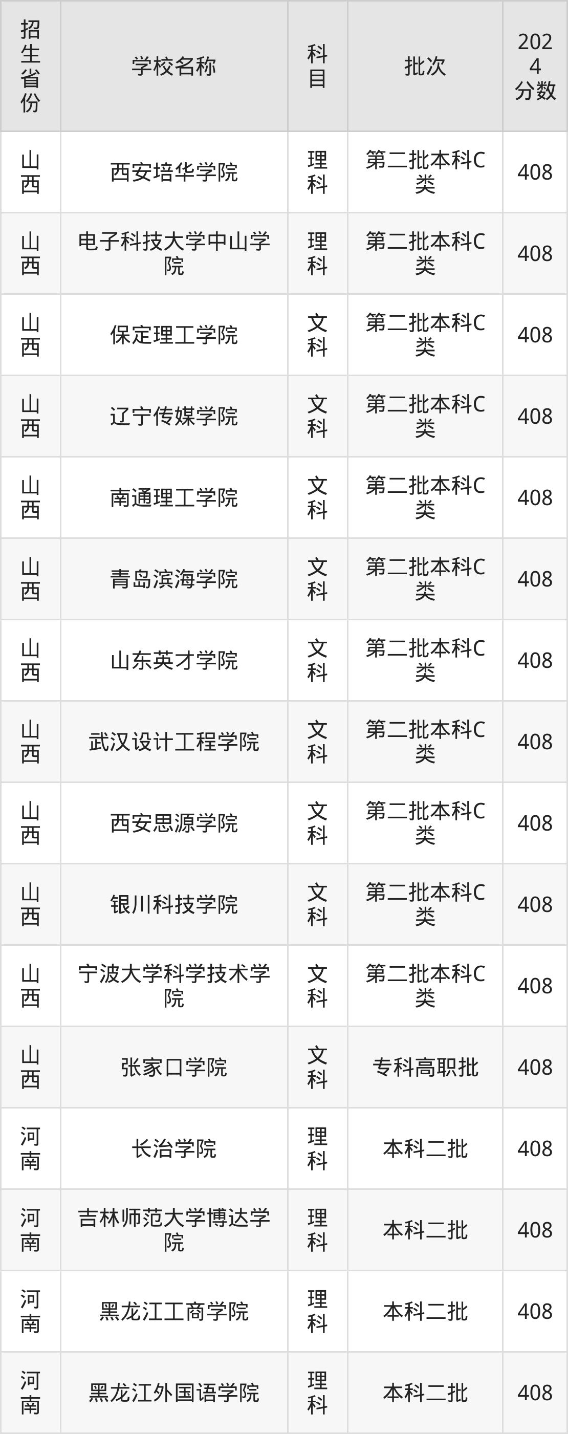 山西省理科分数线是408分的文科大学有:西安培华学院、电子科技大学中山学院。