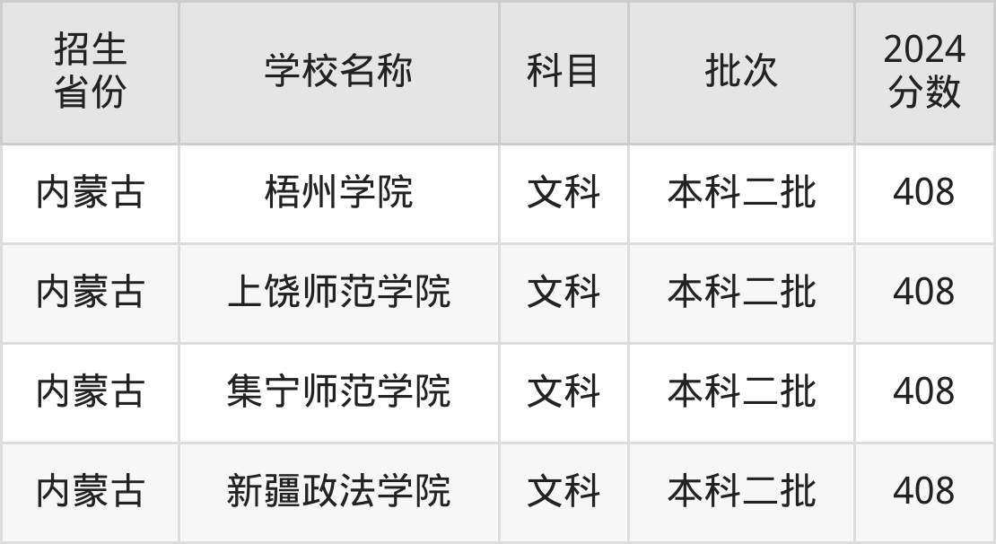 内蒙古自治区文科分数线是408分的文科大学有:陇东学院、商丘师范学院、宜春学院、集美大学诚毅学院、梧州学院、上饶师范学院、集宁师范学院、新疆政法学院。