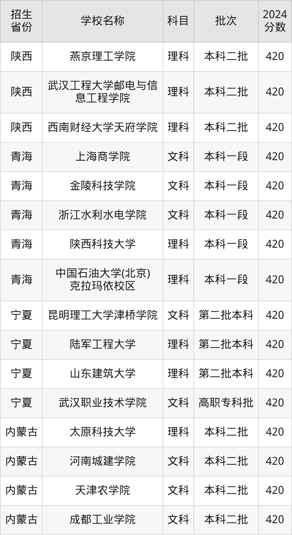 筛选全国各省2024年录取分数线为420分的理科大学如下: