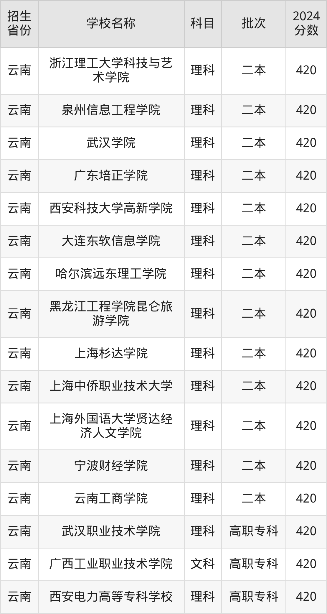云南省理科分数线是420分的理科大学有:南宁学院、南昌工学院、武汉华夏理工学院、沈阳工学院、浙江理工大学科技与艺术学院、泉州信息工程学院、武汉学院、广东培正学院、西安科技大学高新学院、大连东软信息学院。