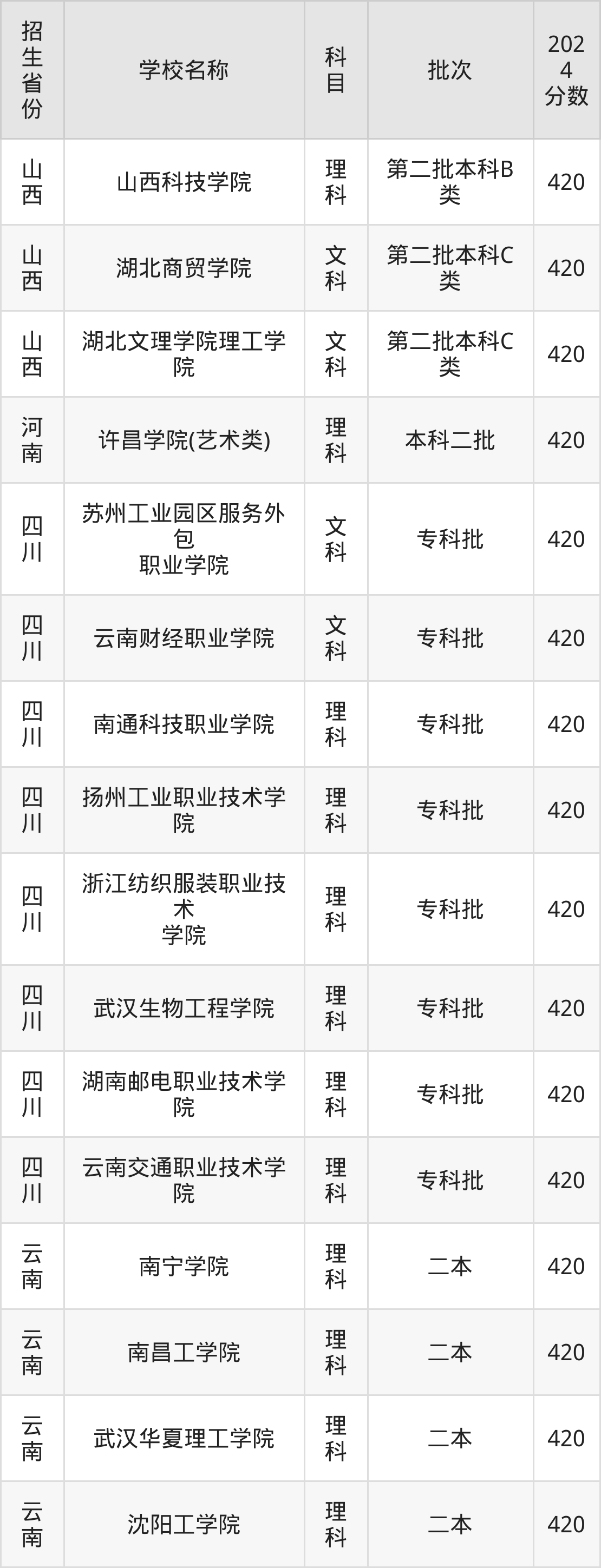 四川省文科分数线是420分的理科大学有:苏州工业园区服务外包职业学院、云南财经职业学院。