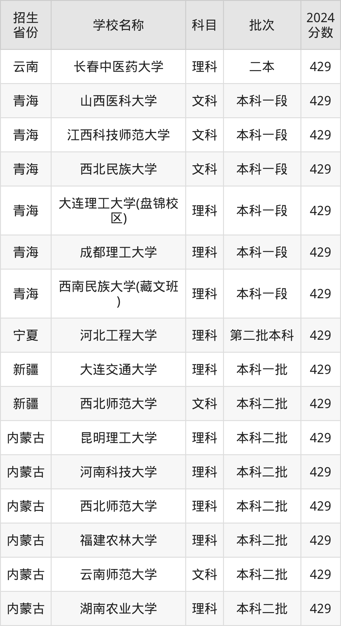 青海省文科分数线是429分的重点大学有:山西医科大学、江西科技师范大学、西北民族大学。