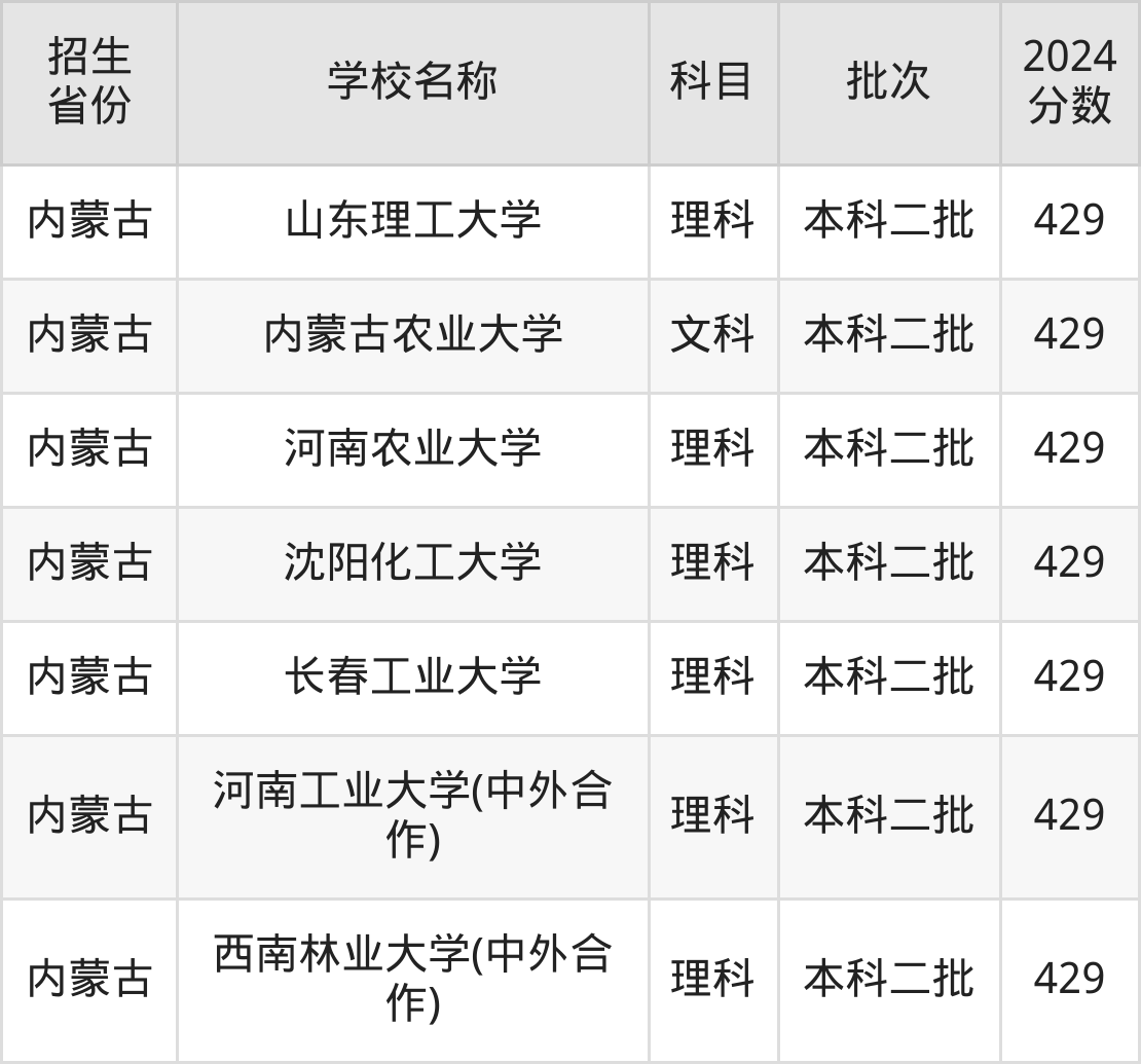 内蒙古自治区理科分数线是429分的重点大学有:昆明理工大学、河南科技大学、西北师范大学、福建农林大学、湖南农业大学、山东理工大学、河南农业大学、沈阳化工大学、长春工业大学、河南工业大学(中外合作)。