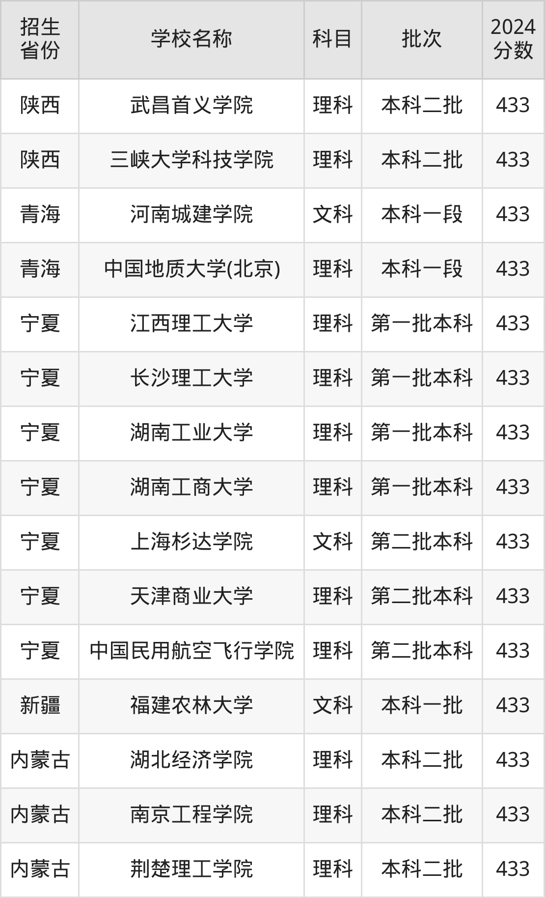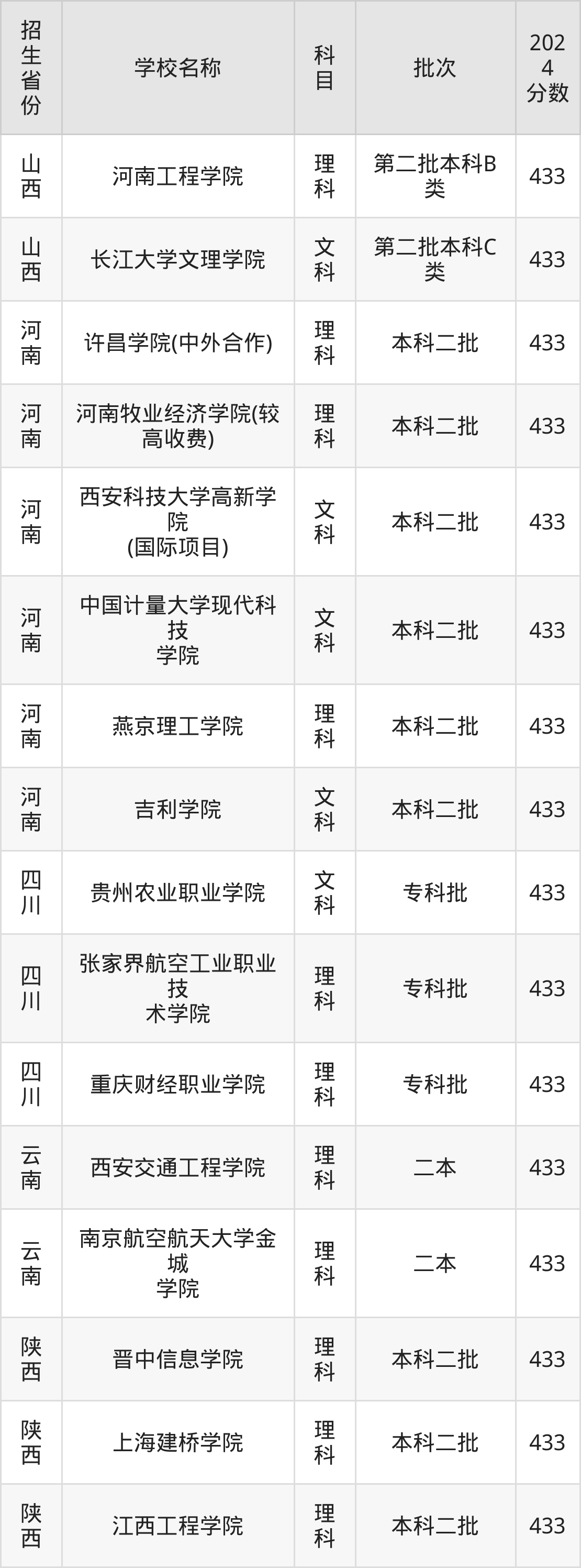 筛选全国各省2024年录取分数线为433分的理科大学如下: