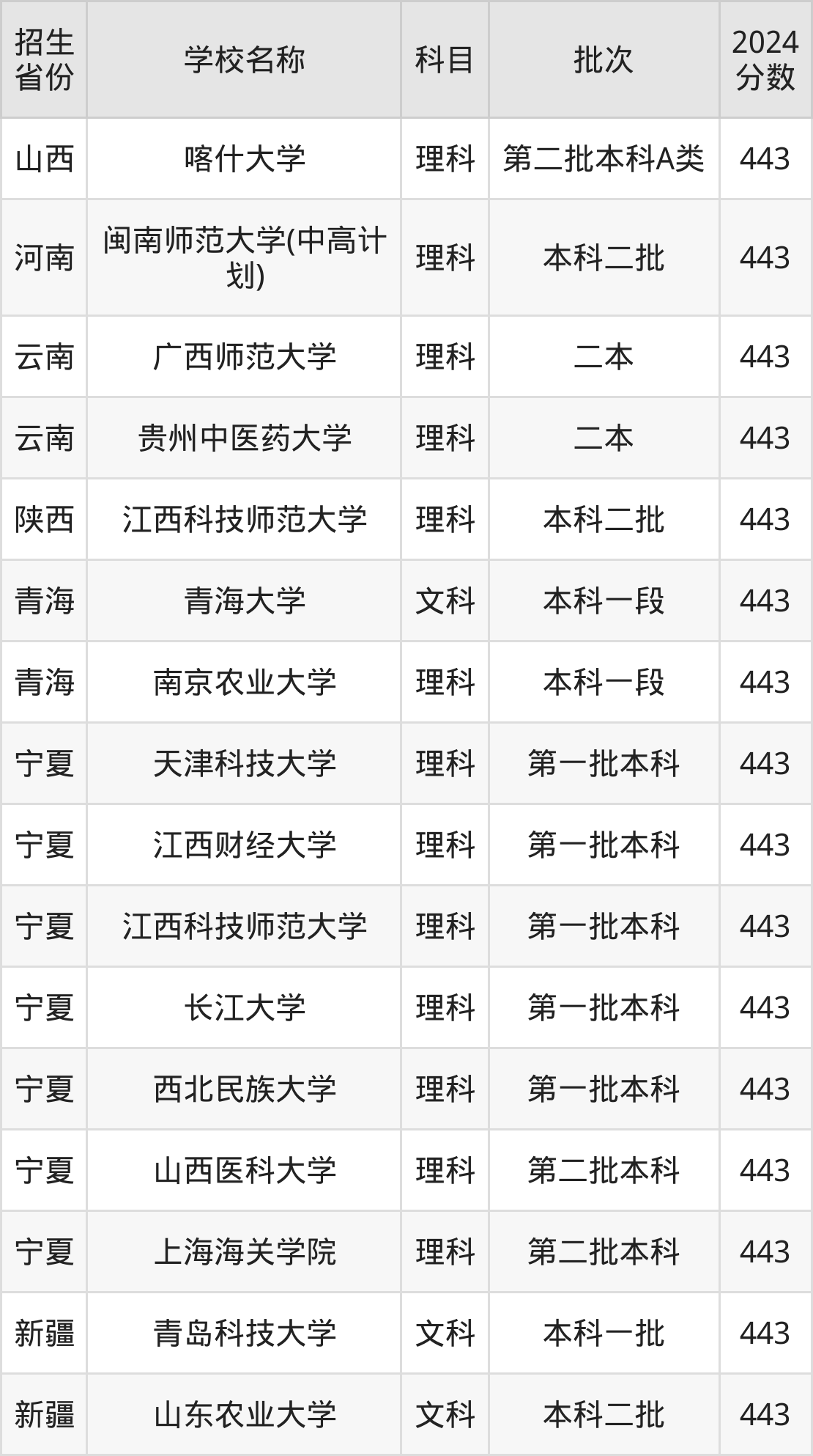 筛选全国各省2024年录取分数线为443分的重点大学如下: