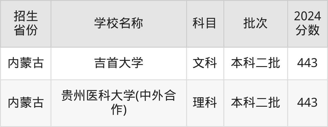 内蒙古自治区理科分数线是443分的重点大学有:贵州医科大学(中外合作)。