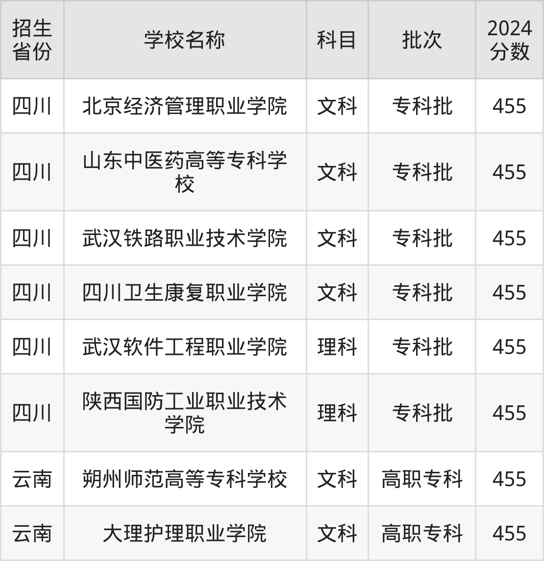 筛选全国各省2024年录取分数线为455分的公办专科大学如下: