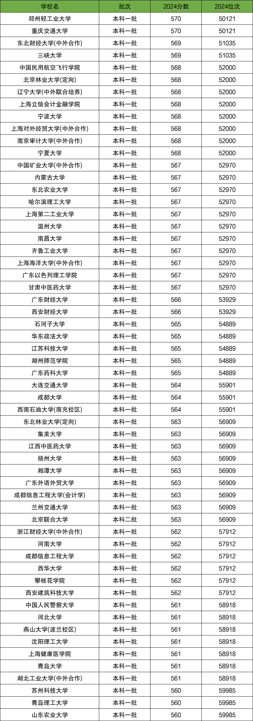 2024年全国大学在四川理科中录取位次为5-6万的大学有58所,对应分数区间为570-560分。