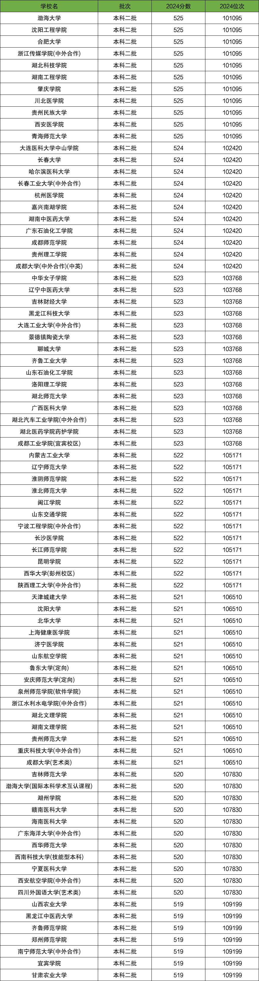 1、525分对应位次101095,有渤海大学、沈阳工程学院、合肥大学、浙江传媒学院(中外合作)、湖北科技学院、湖南工程学院、肇庆学院、川北医学院、贵州民族大学、西安医学院、青海师范大学。