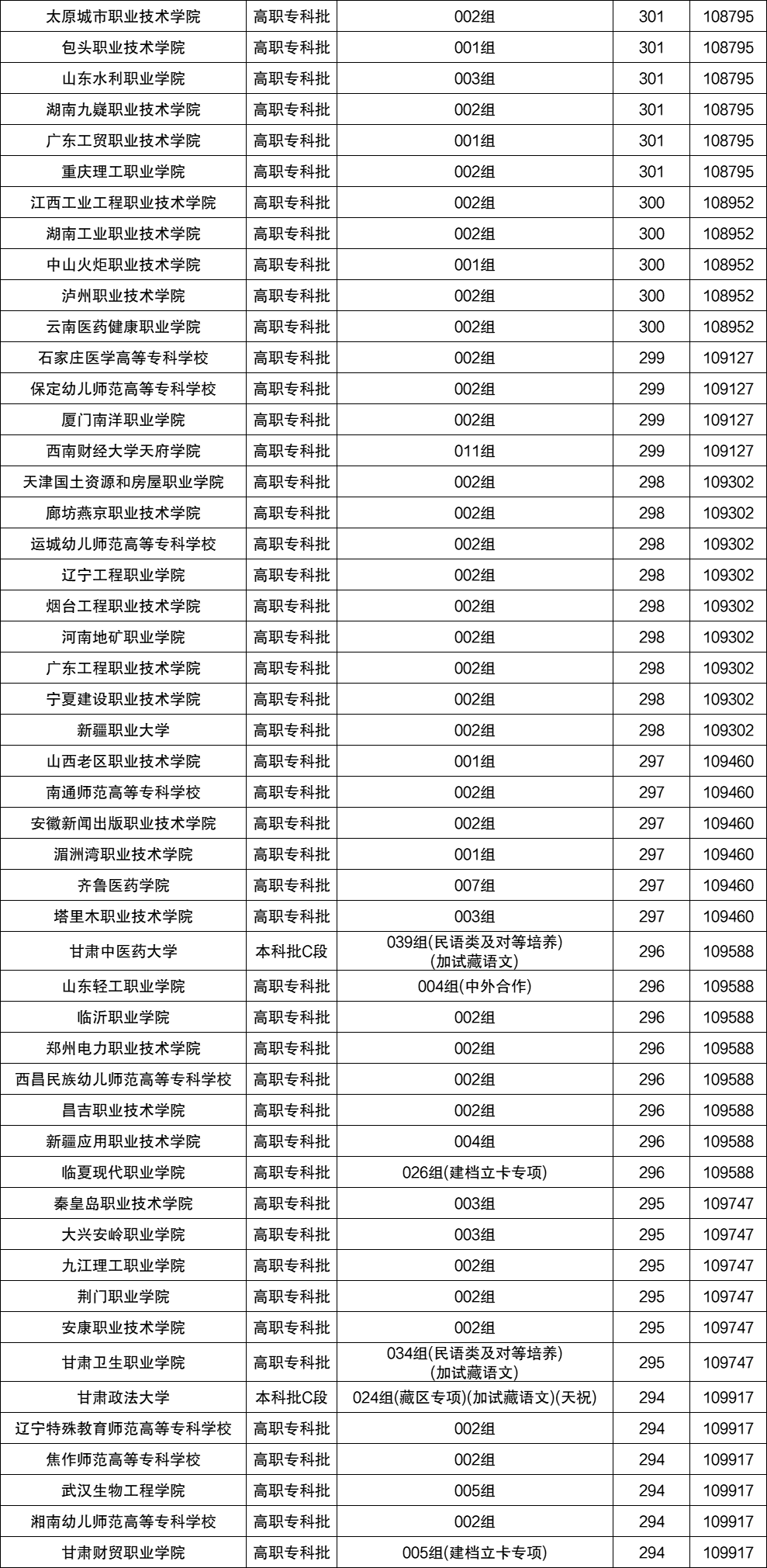 2024年全国大学在甘肃物理类中录取位次为10-11万的大学有287个院校专业组,对应分数区间为340-294分。
