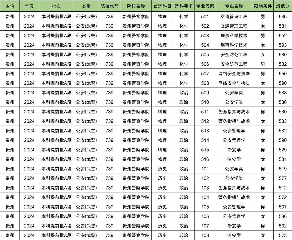 贵州警察学院2024年录取分数线已为大家整理如下,包含贵州警察学院在贵州省的公安专业录取分数线,包含2024年学校的招生简章、招生计划等,供2024届考生及家长参考。