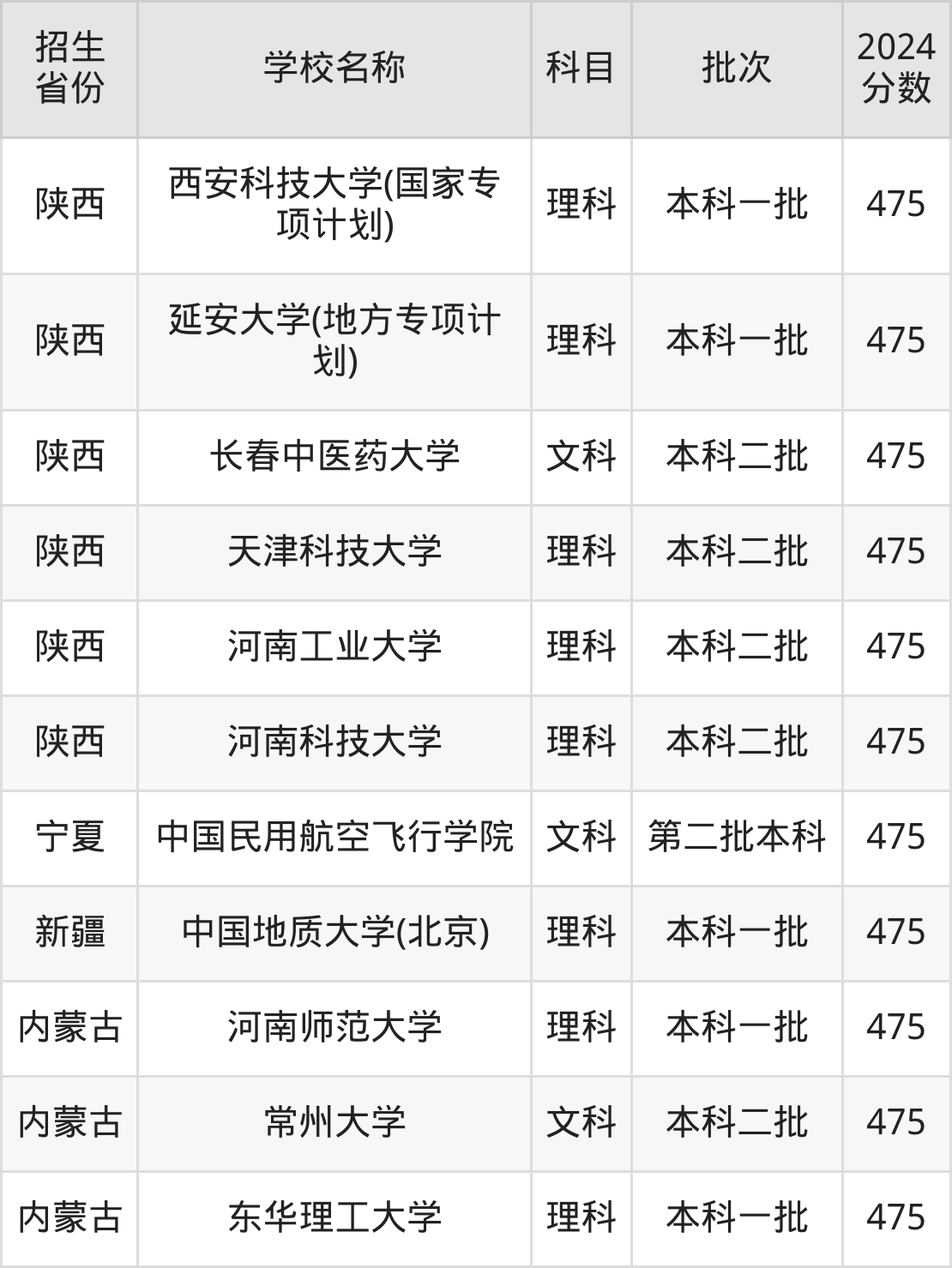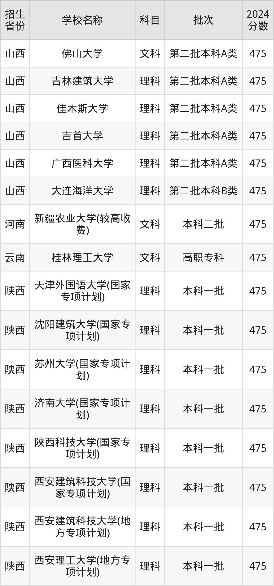 筛选全国各省2024年录取分数线为475分的重点大学如下: