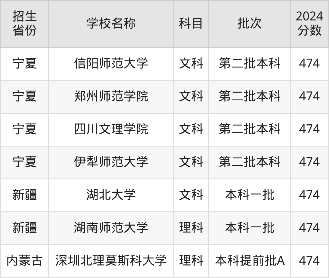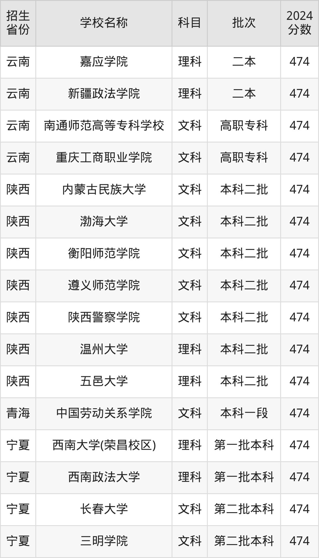 筛选全国各省2024年录取分数线为474分的文科大学如下: