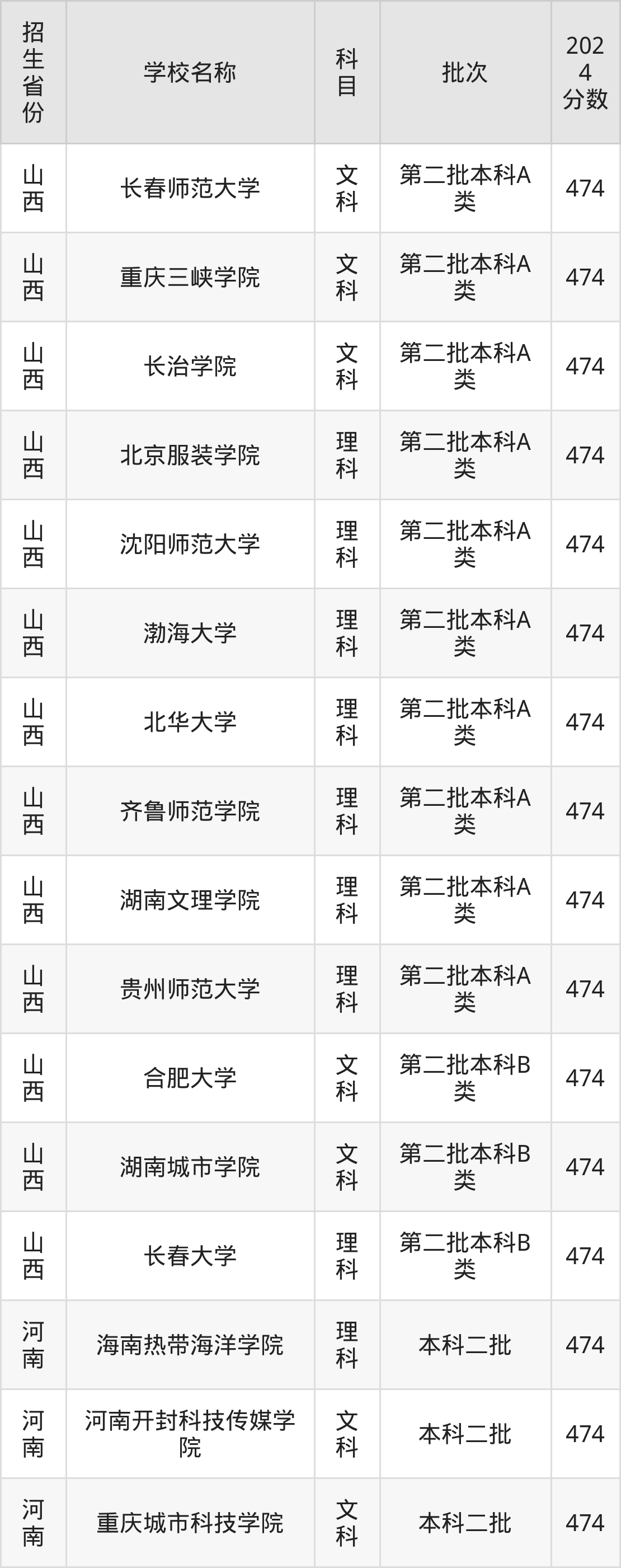 山西省文科分数线是474分的文科大学有:长春师范大学、重庆三峡学院、长治学院、合肥大学、湖南城市学院。