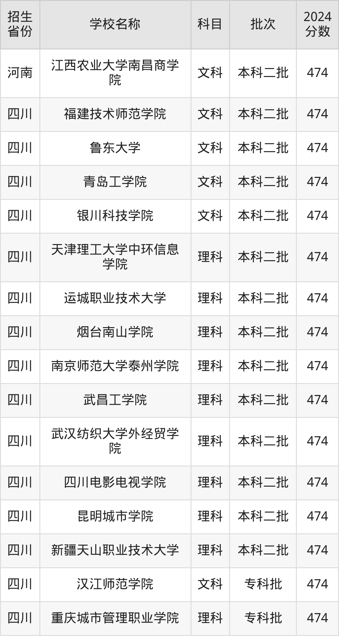 四川省理科分数线是474分的文科大学有:天津理工大学中环信息学院、运城职业技术大学、烟台南山学院、南京师范大学泰州学院、武昌工学院、武汉纺织大学外经贸学院、四川电影电视学院、昆明城市学院、新疆天山职业技术大学、重庆城市管理职业学院。