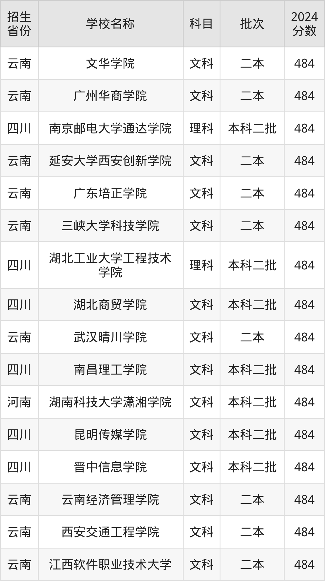 484分可以上的大学有文华学院、广州华商学院、南京邮电大学通达学院、延安大学西安创新学院等二本民办大学。本文整理了云南、四川等全国484分左右的二本民办大学名单,请2025年高考生参考。