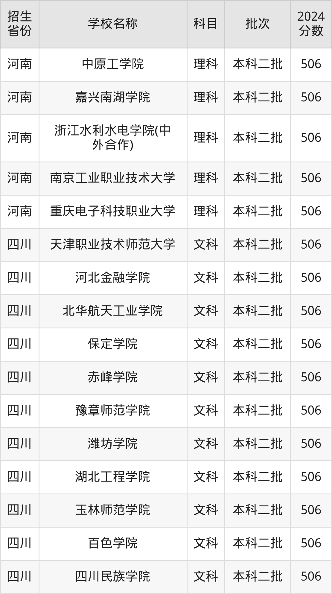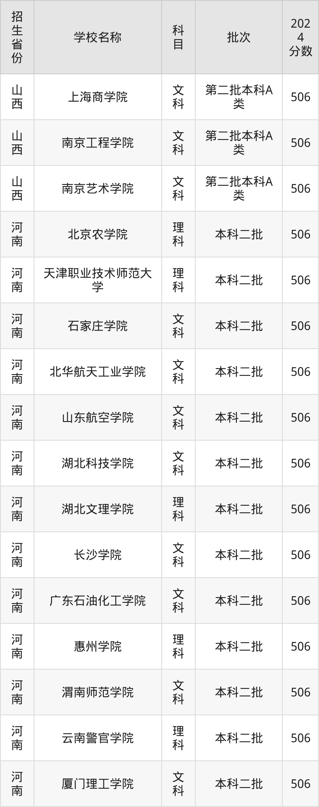 河南省理科分数线是506分的二本公办大学有:北京农学院、天津职业技术师范大学、湖北文理学院、惠州学院、云南警官学院、中原工学院、嘉兴南湖学院、浙江水利水电学院(中外合作)、南京工业职业技术大学、重庆电子科技职业大学。