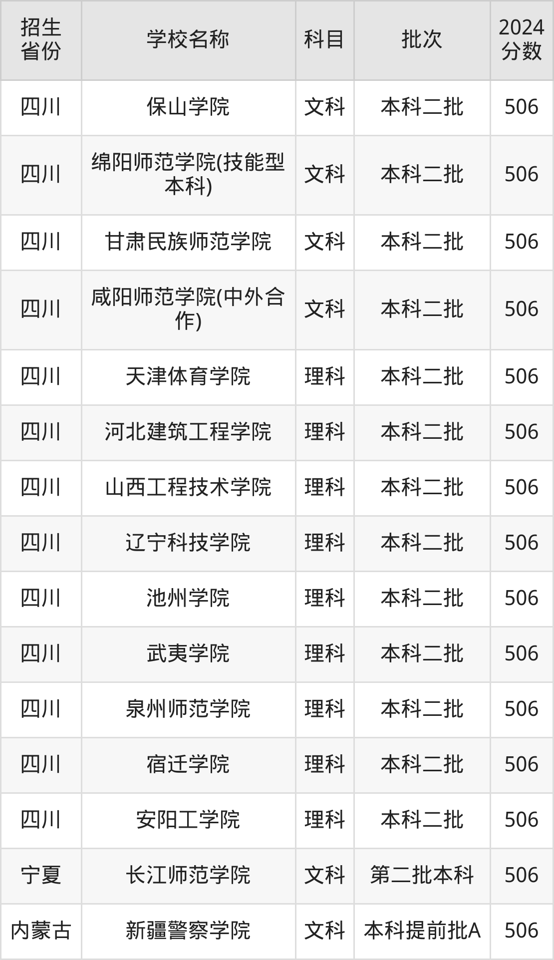 四川省理科分数线是506分的二本公办大学有:天津体育学院、河北建筑工程学院、山西工程技术学院、辽宁科技学院、池州学院、武夷学院、泉州师范学院、宿迁学院、安阳工学院。