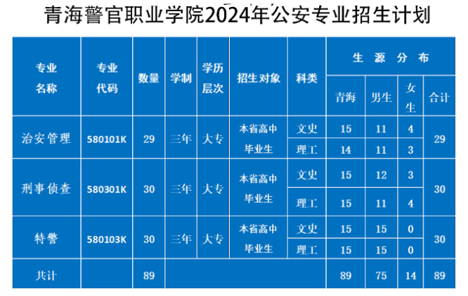 青海警官职业学院在青海公安类专科共计招生89人,其中文科招生人数共计45人,理科招生人数共计44人。学院公安专业招生计划需报请青海省公安厅核准后,报青海省教育厅,女生计划数不超过公安专业招生计划数的15%。