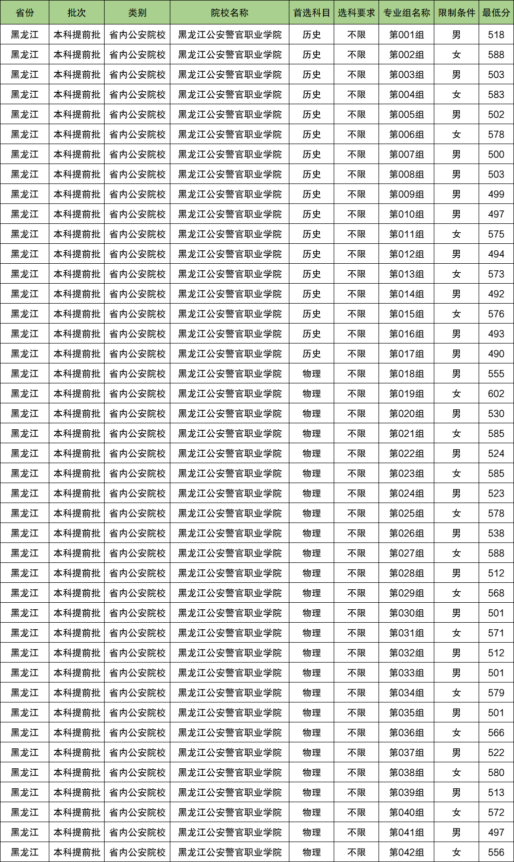 黑龙江公安警官职业学院2024年录取分数线已为大家整理如下,包含黑龙江公安警官职业学院在黑龙江省的公安专业录取分数线,包含2024年学校的招生简章、招生计划等,供2024届考生及家长参考。