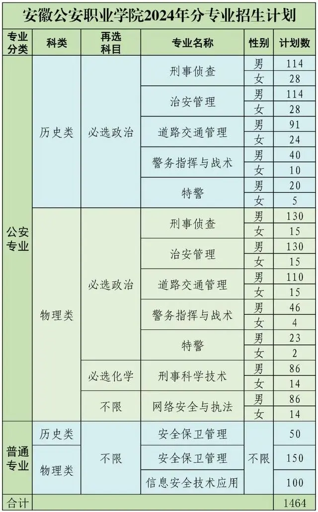 安徽公安职业学院2024年计划招收1464名学生,分布在刑事侦查、治安管理、道路交通管理、刑事科学技术、网络安全与执法、警务指挥与战术、特警等7个公安专业。此外,学院还计划招收2个普通专业,即安全保卫管理和信息安全技术应用。其中公安专业共招生1164人,普通专业招生300人。