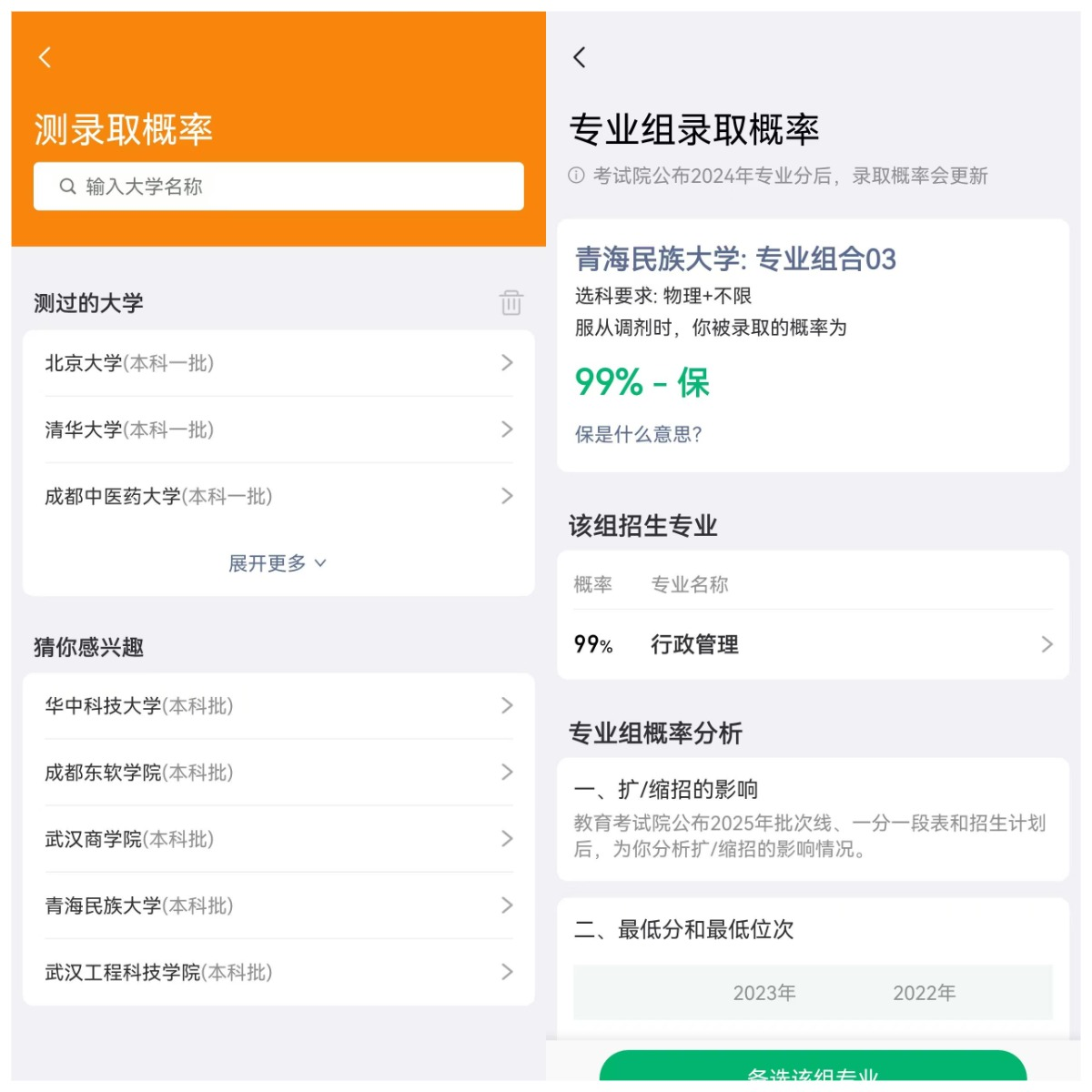 智能推荐专业:在测大学录取概率的同时,系统还会根据考生的分数和兴趣偏好智能推荐适合的专业方向。