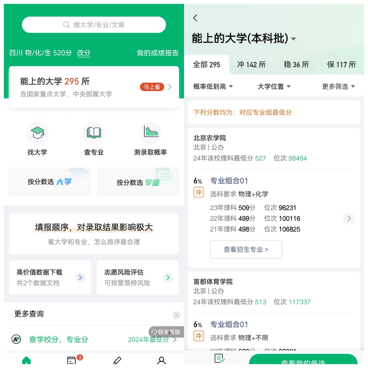 功能描述:考生只需在APP中输入自己的高考分数、所在省份及选考科目等信息,系统即可快速分析并推荐出考生分数范围内能够报考的大学列表。列表中的大学按照录取概率从高到低排序,方便考生快速定位到适合自己的目标院校。