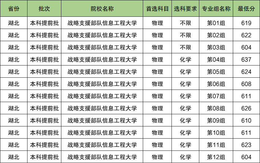 2024年战略支援部队信息工程大学生长军官本科学员在湖北的录取分数线整理如下,供大家参考。