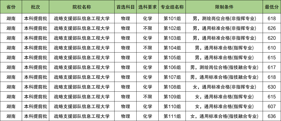2024年战略支援部队信息工程大学生长军官本科学员在湖南的录取分数线整理如下,供大家参考。