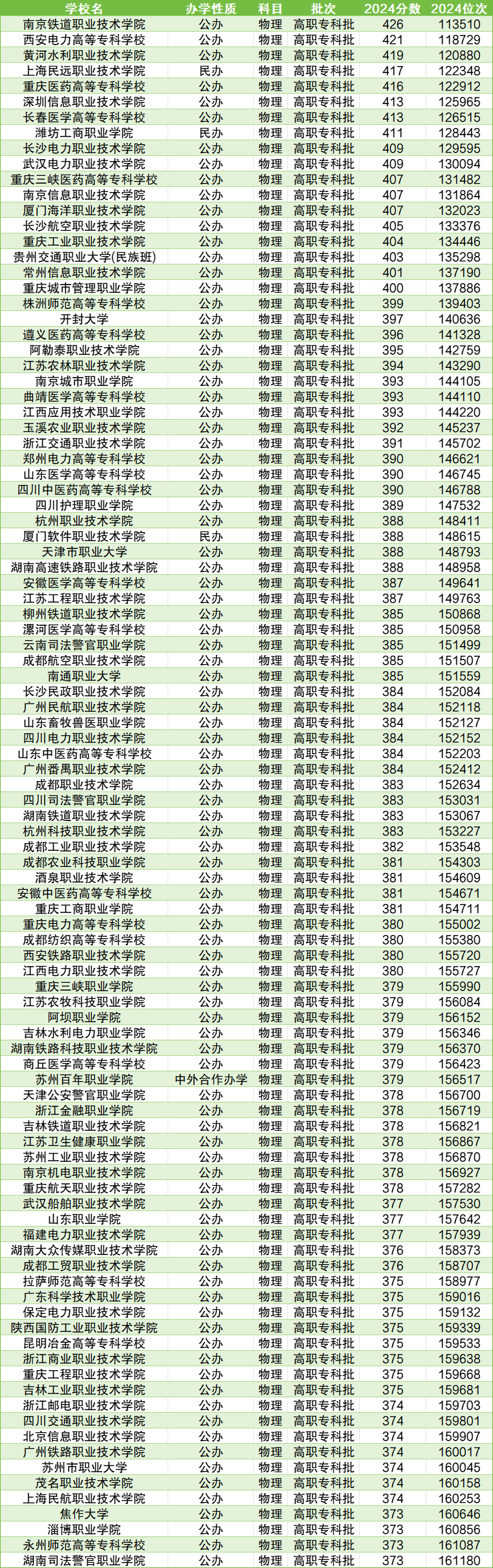 专科大学中分数线最高的是南京铁道职业技术学院,2024年最低分426分。另外录取线超过420分的还有西安电力高等专科学校(421分)。分数线最高的五所公办大专还包括419分的黄河水利职业技术学院、416分的重庆医药高等专科学校和413分的深圳信息职业技术学院。