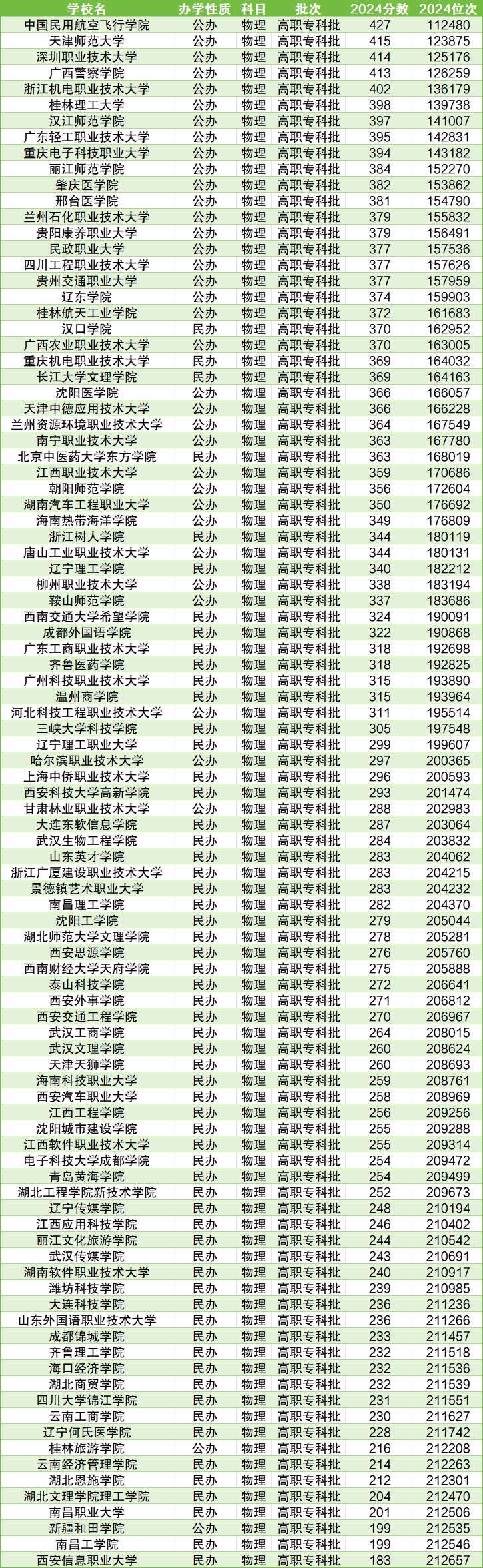 贵州水利水电职业技术学院180分、黔西南民族职业技术学院182分、伊春职业学院184分、贵州文化旅游职业学院184分、黔东南民族职业技术学院185分。