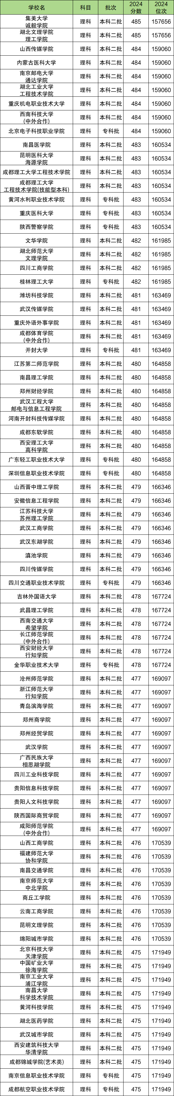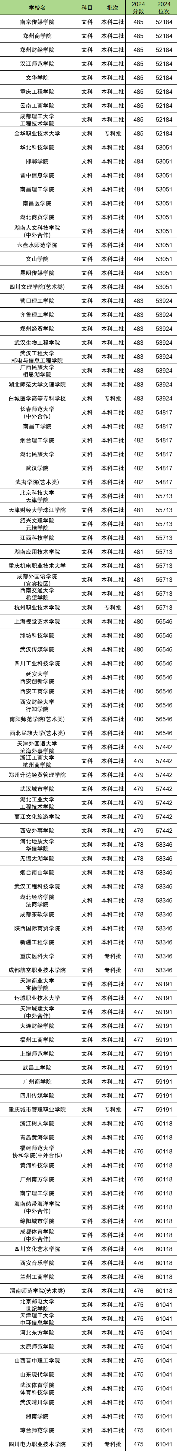 文科480分(加减五分)左右能上的大学对应位次排名从52184到61041。理科480分左右能上的大学对应位次排名从157656到171949。文科480分超二本线23分,不算太高,所以能选的公办大学并不多;理科480超二本线21分,不算太高,所以能选的公办大学并不多。