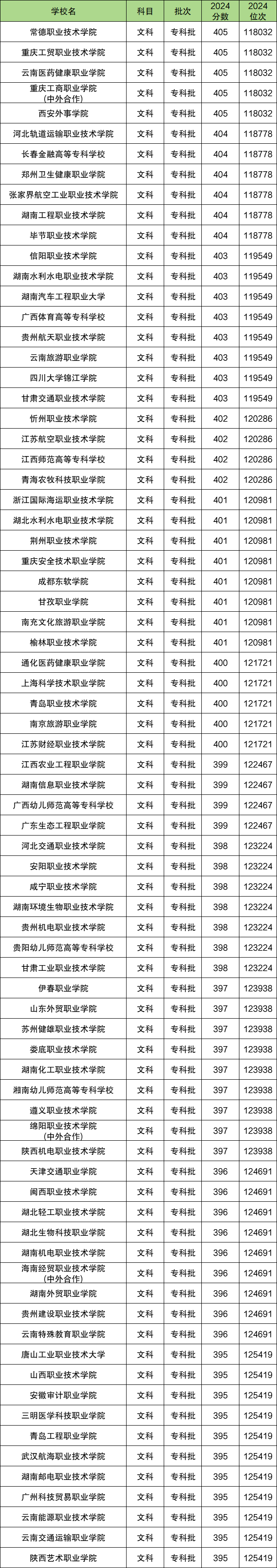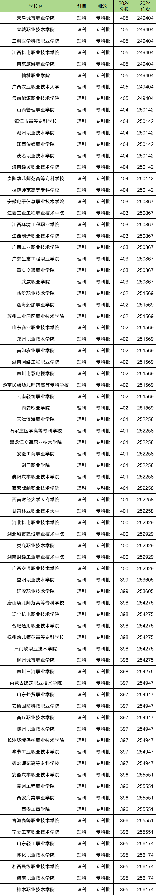 文科400分(加减五分)左右能上的大学对应位次排名从118032到125419。理科400分左右能上的大学对应位次排名从249404到256174。文理科400分超专科250分,大概率都可以走公办专科。