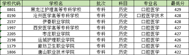 在河北省,历史类分数线在420-430分之间的口腔医学专业大学有8所,包括黑龙江护理高等专科学校、沧州医学高等专科学校、伊春职业学院、西安医学高等专科学校、枣庄职业学院、运城护理职业学院、廊坊卫生职业学院和唐山职业技术学院,下图为各大学的口腔医学专业分数线。