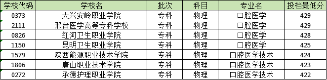 在河北省,物理类分数线在420-430分之间的口腔医学专业大学有7所,大兴安岭职业学院、邢台医学高等专科学校、红河卫生职业学院、昆明卫生职业学院、陕西能源职业技术学院、唐山职业技术学院、承德护理职业学院,下图为各大学的口腔医学专业分数线。