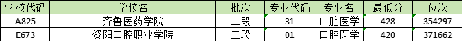 在山东省,分数线420-430分之间的口腔医学专业大学有2所,为齐鲁医药学院和资阳口腔职业学院,其中资阳口腔职业学院的口腔医学专业分数相对较低,为420分,对应全省位次371662,超过山东省二段线270分。