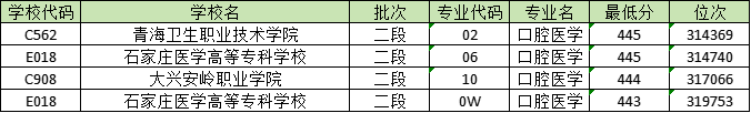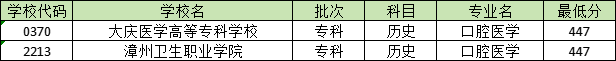 在河北省,历史类分数线在440-450分之间的口腔医学专业大学有2所,包括大庆医学高等专科学校和漳州卫生职业学院,下图为各大学的口腔医学专业分数线。