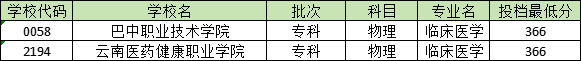 在河北省,物理类分数线在360-370分之间的临床医学专业大学有2所,包括巴中职业技术学院和云南医药健康职业学院,下图为各大学的临床医学专业分数线。