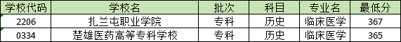 在河北省,历史类分数线360-370分之间的临床医学专业大学有2所,包括扎兰屯职业学院和楚雄医药高等专科学校,下图为各大学的临床医学专业分数线。