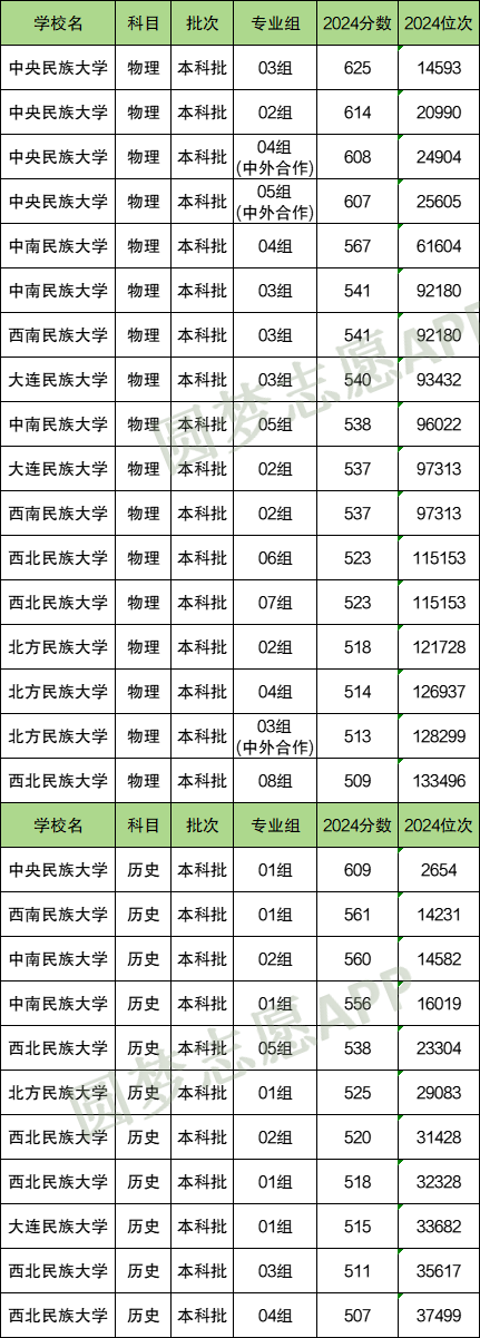 中央民族大学(03组)在2024年江苏物理类中录取分数最高,分数是625分,位次在14593名;西北民族大学(08组)在物理类录取分数是509分,位次在133496名。