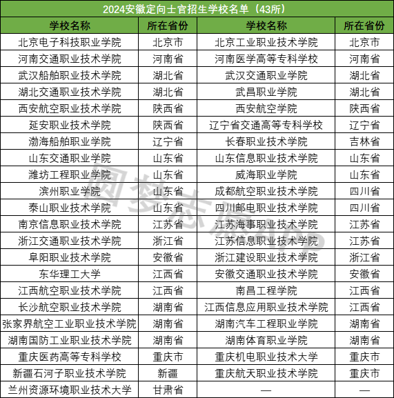 上文谈到了2024年面向安徽省招生的定向士官学校共43所,包括阜阳职业技术学院、安徽交通职业技术学院、山东信息职业技术学院、山东交通职业学院、长沙航空职业技术学院、渤海船舶职业学院、南昌工程学院、武昌职业学院、河南交通职业技术学院等。